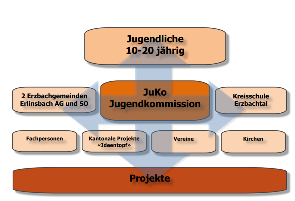 - den zwei politischen Gemeinden im Erzbachtal, Erlinsbach AG und SO,der jeweilig zuständige Vertreter des Ressorts ‚Jugend‘ ist in der JuKo vertreten.